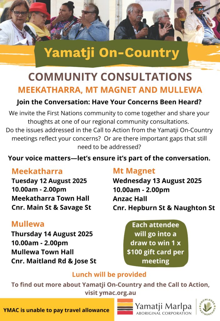 In August, workshops are being held in Meekatharra, Mt Magnet, and Mullewa, giving local people a chance to share their views, raise important issues, and help guide the direction of the 2025 On-Country gathering in Geraldton in September.